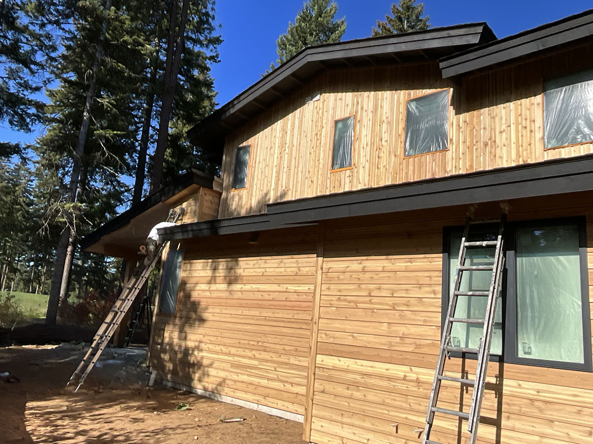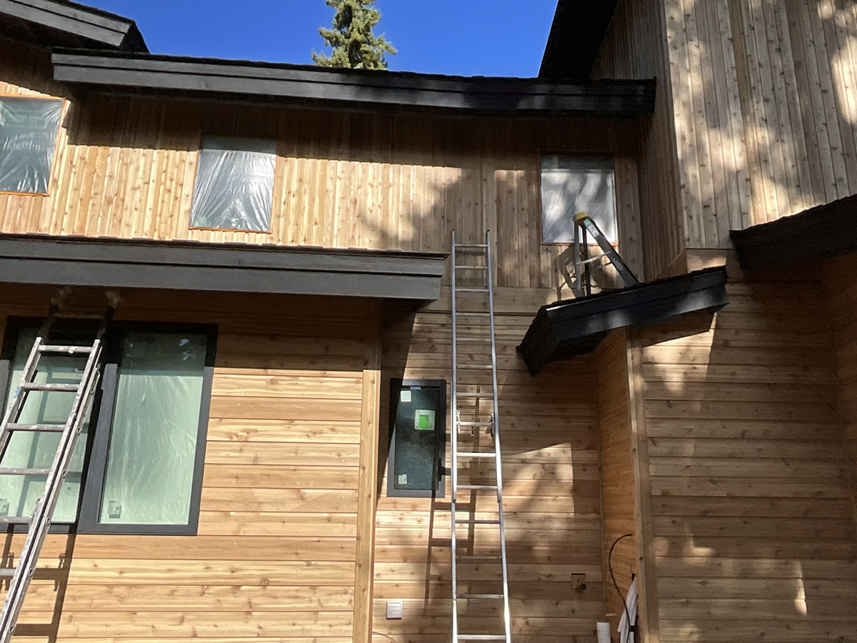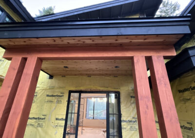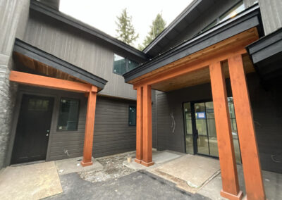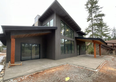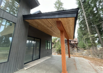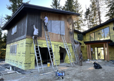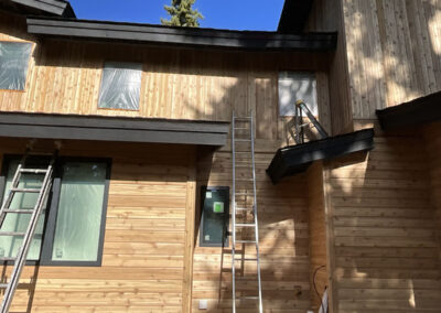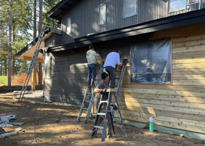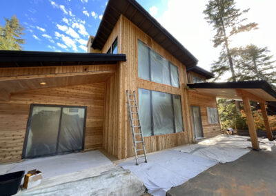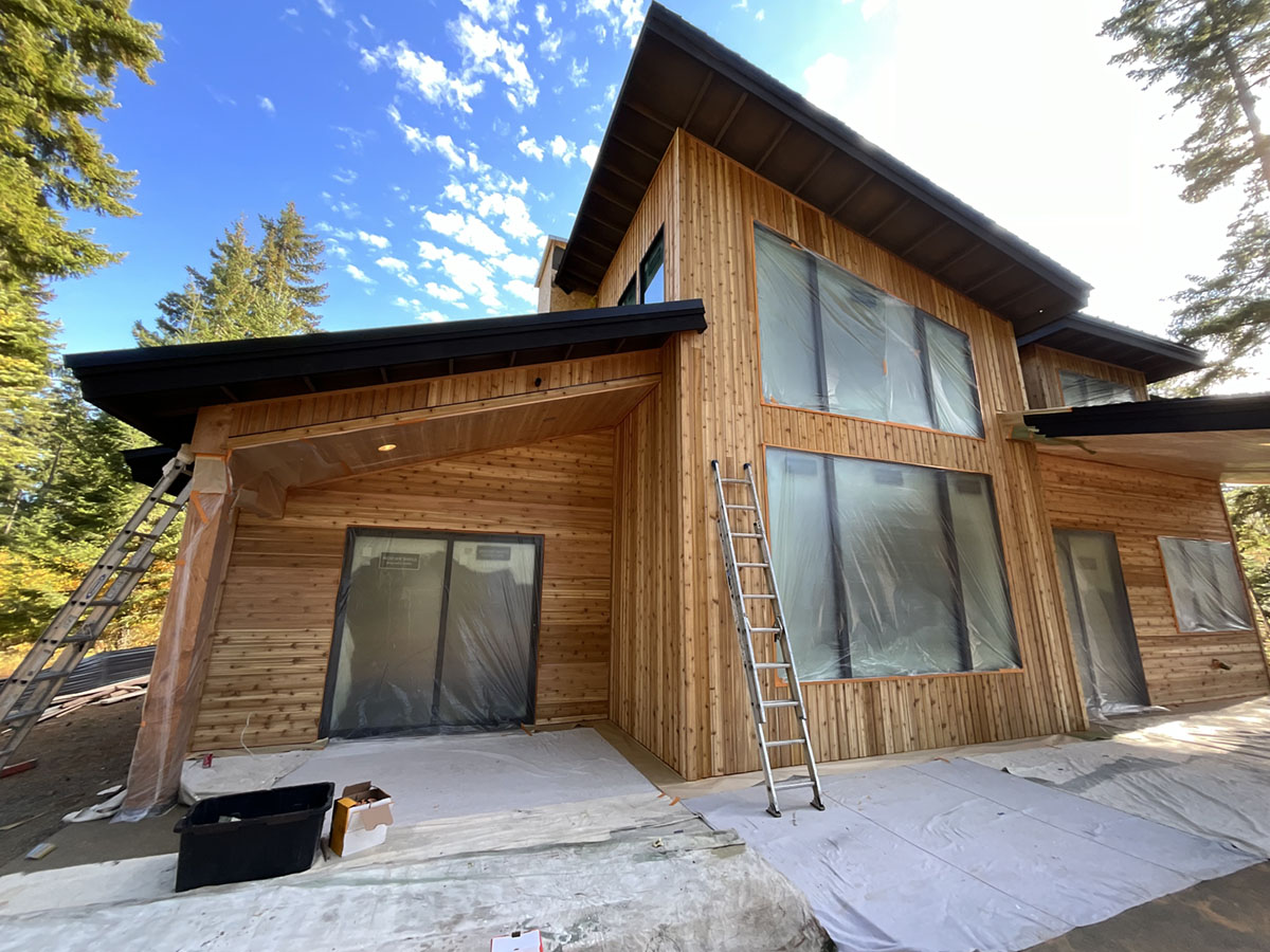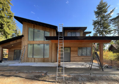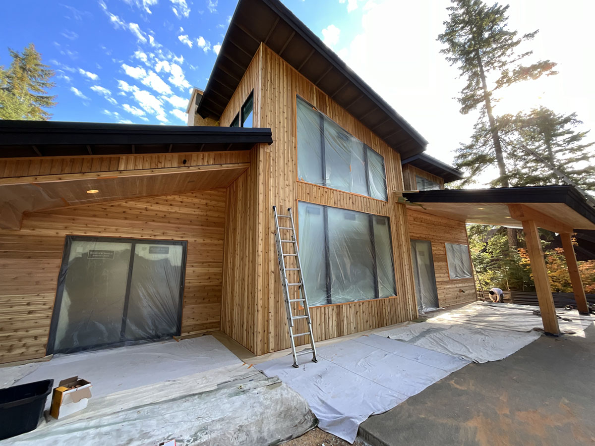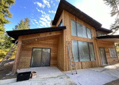 Suncadia Cabin Custom Stained Exterior Full interior, doors & millwork New construction with semi transparent body, tri-corn black trim, clear coat underneath tongue and groove…