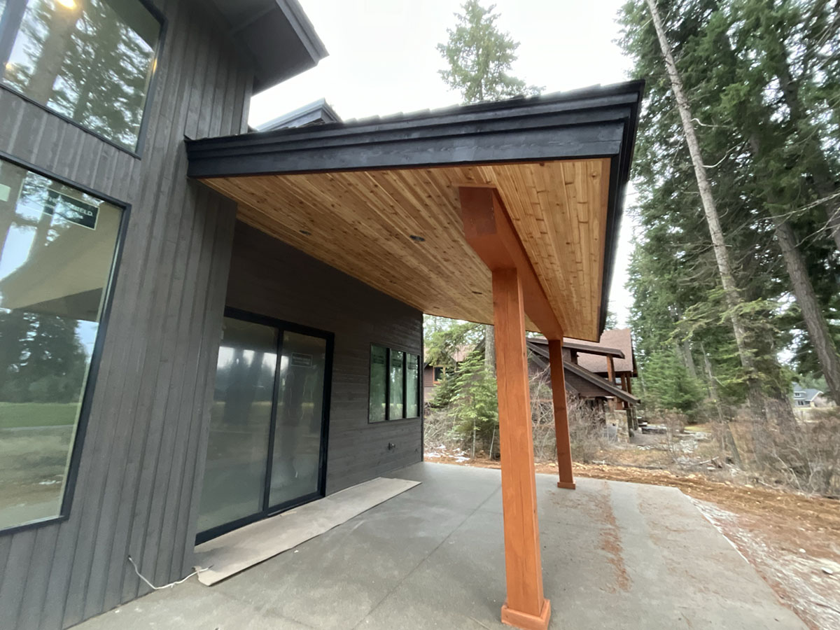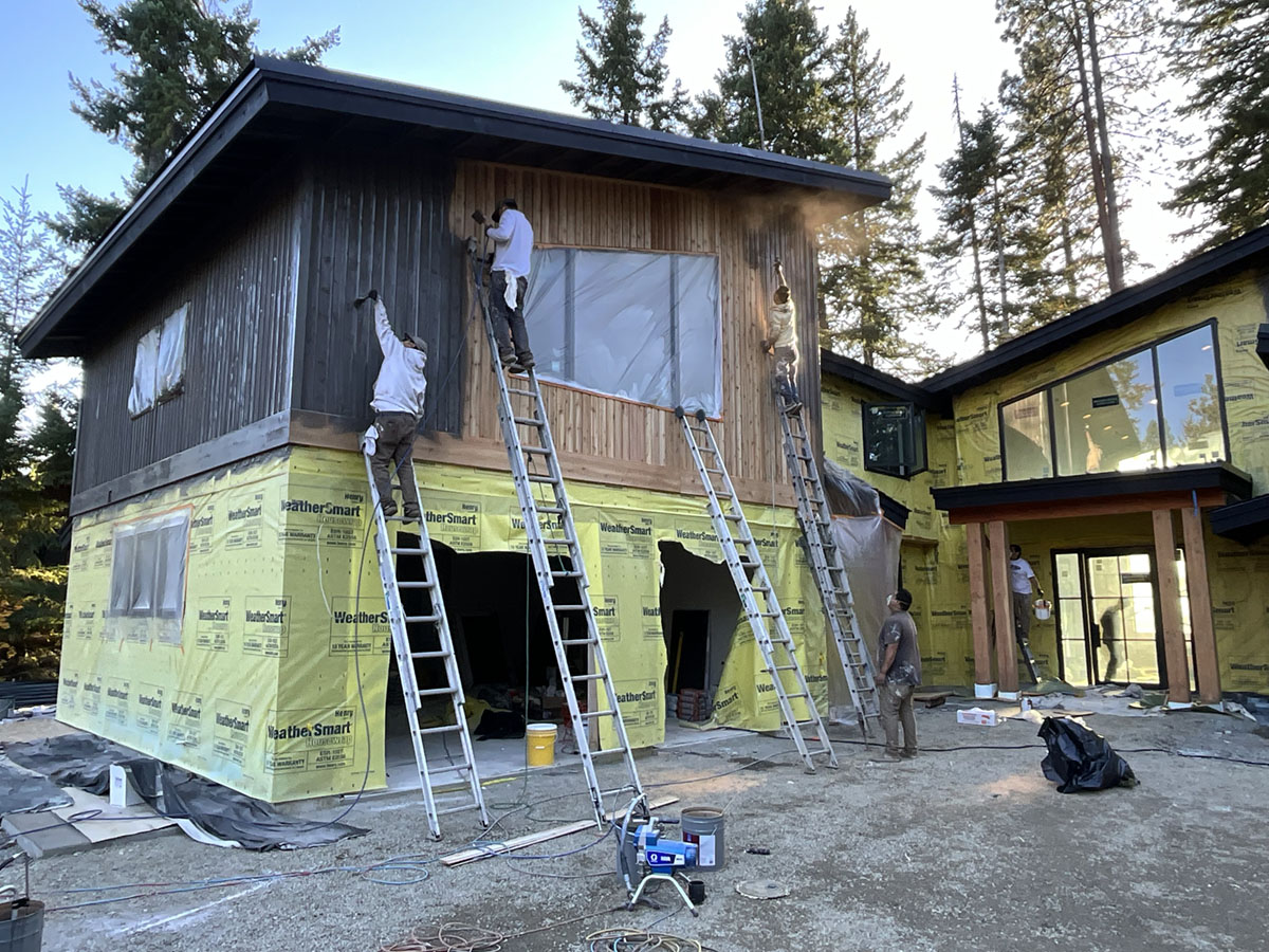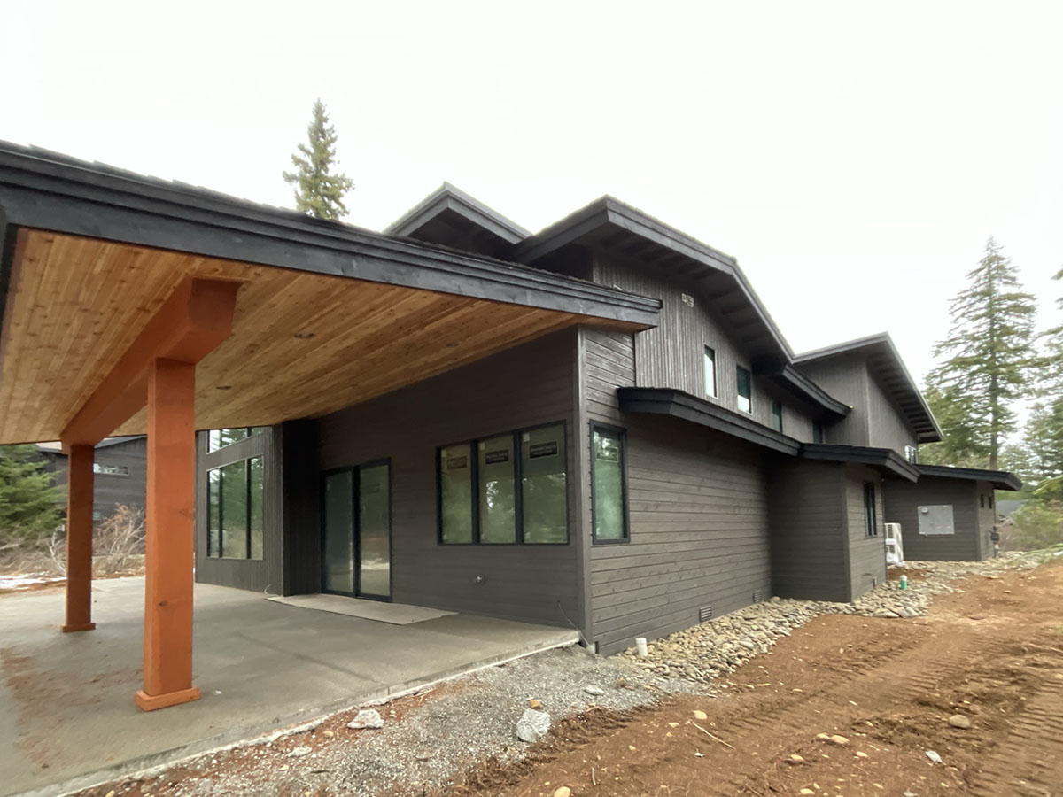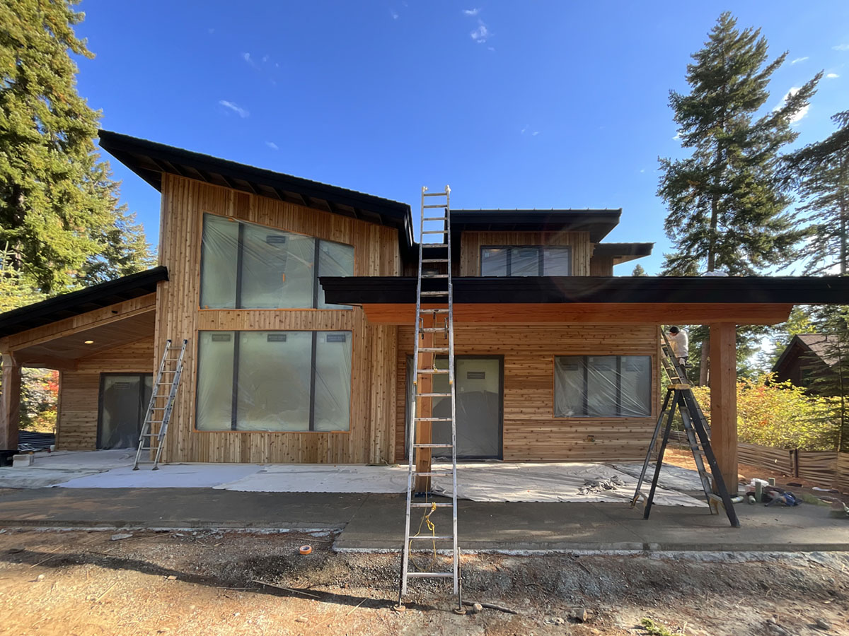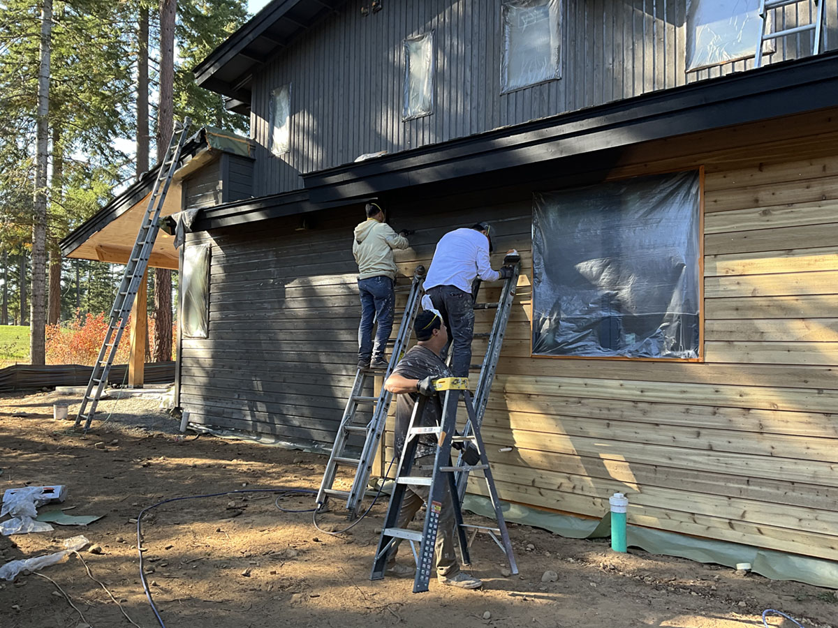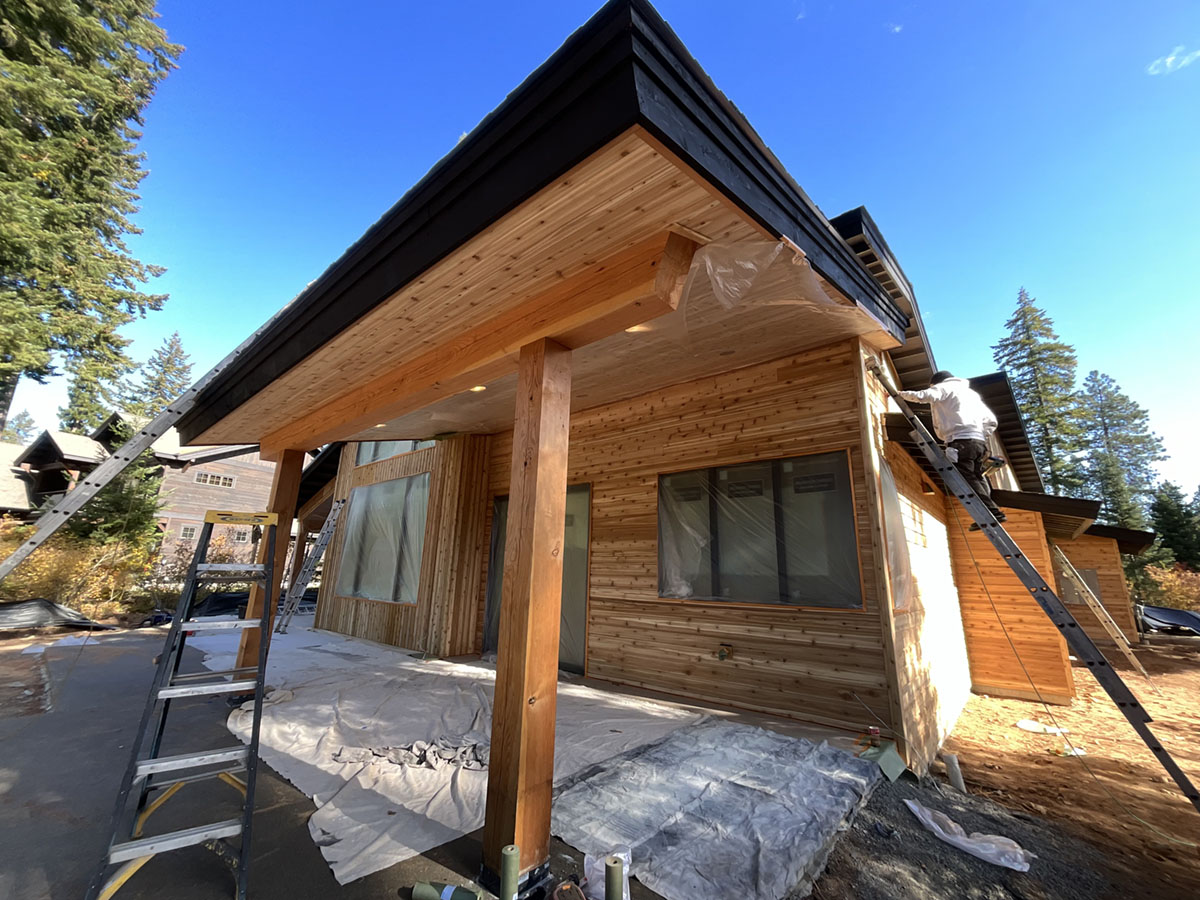 Suncadia Cabin Custom Stained Exterior Full interior, doors & millwork New construction with semi transparent body, tri-corn black trim, clear coat underneath tongue and groove…