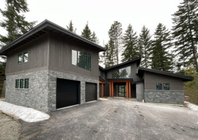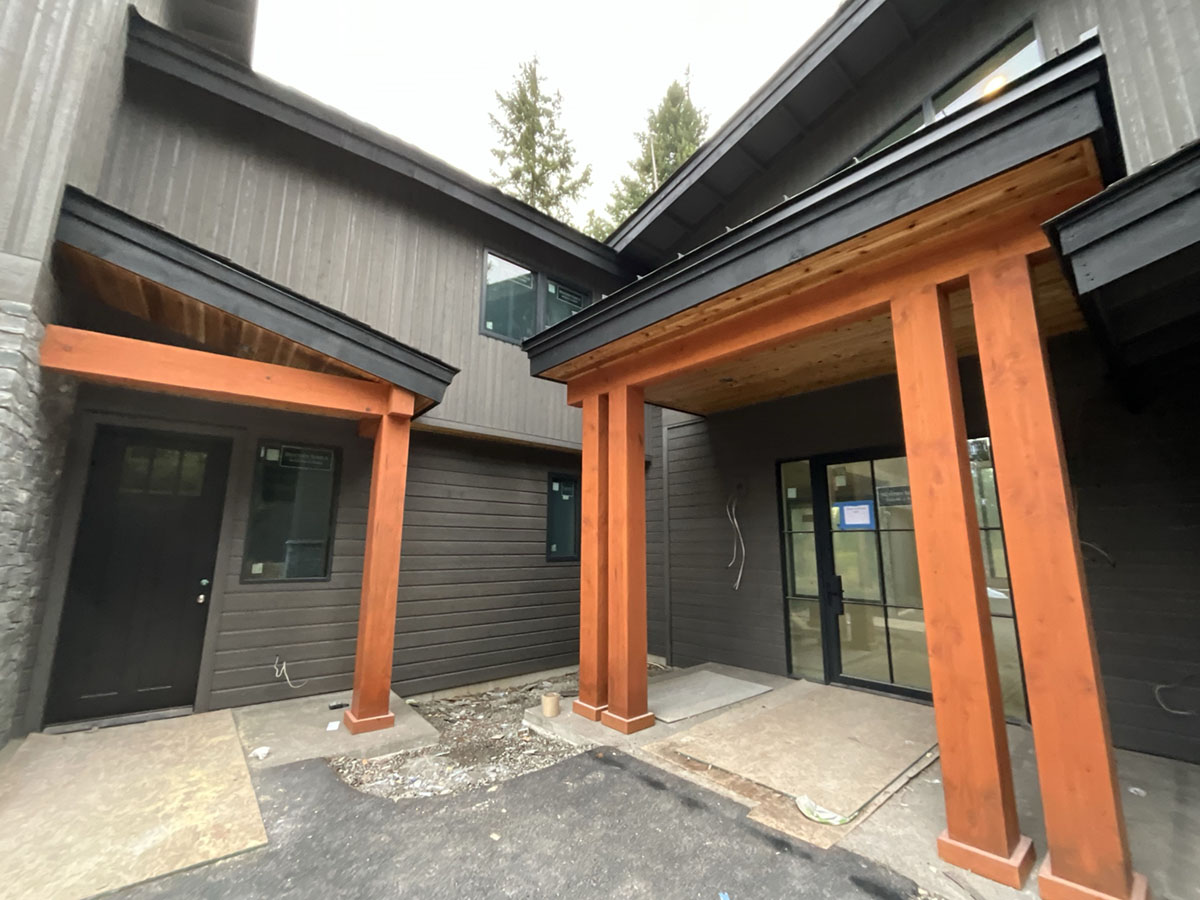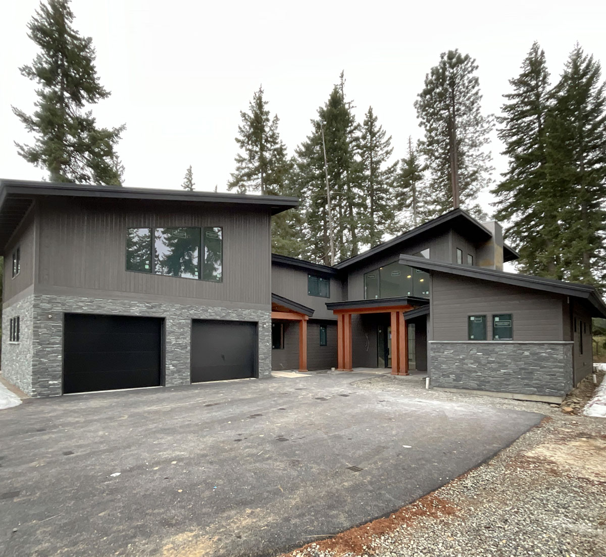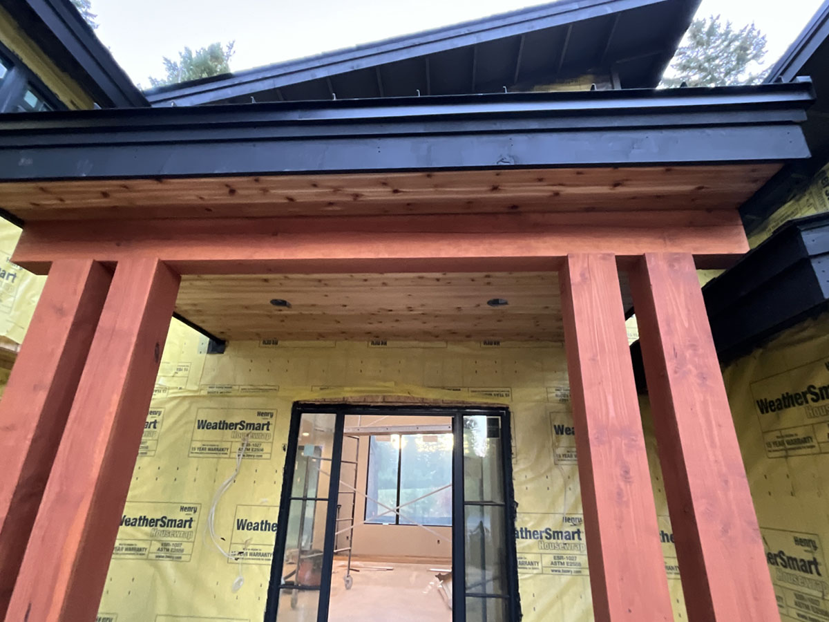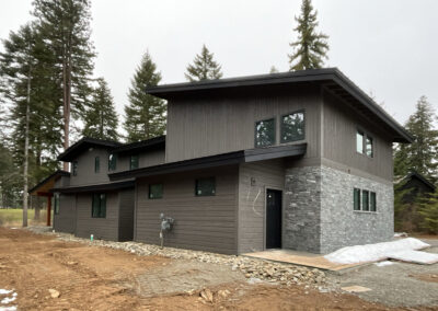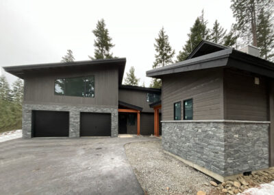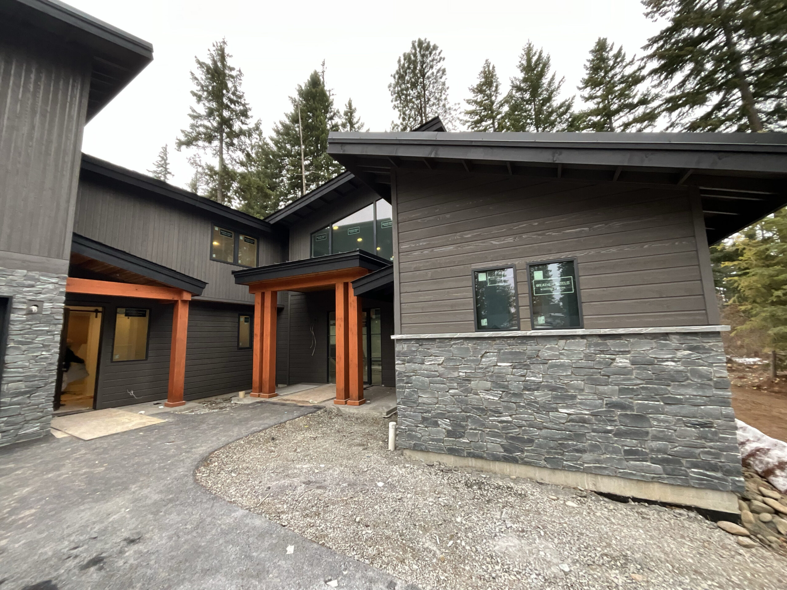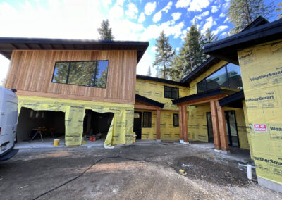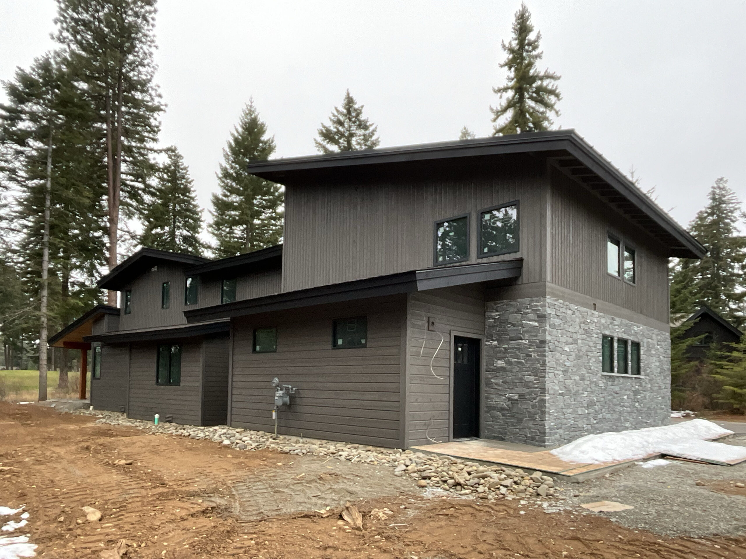 Suncadia Cabin Custom Stained Exterior Full interior, doors & millwork New construction with semi transparent body, tri-corn black trim, clear coat underneath tongue and groove…